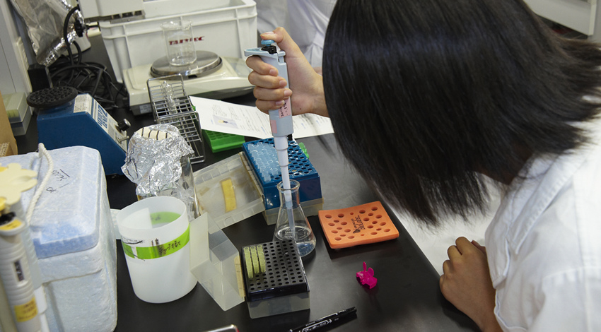 液の色が違うのが分かります。つまり、エタノールが生成されたことが確認できた、ということ。実験は成功です。今回はすでに結果がわかっていることを、確認する「実験」でした。大学で行っているのは「研究」です。これは答えや結果のわからない作業です。知識や情報を活かして、結果を予想して挑みます。未来を変えるような大発見があるかもしれません。大変だけど、自分次第でやりがいも感じられる。それが大学での学びなのです。 |