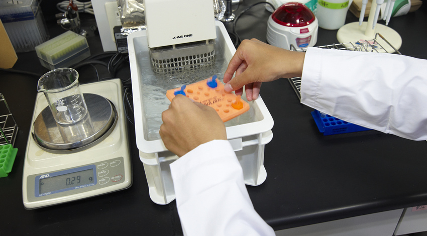 反応液ができたら、50℃の恒温槽に入れて反応させます。このまま約50分おいておきます。そうするとグルコースと酵素が反応し、エタノールが生成されるのです。写真の装置が恒温槽です。読んで字の通り、一定の温度を保つための機械です。このように実験のためのさまざまな装置が研究室には設置されています。数多くの試薬が取りそろえられていたり、動物細胞が液体窒素でマイナス196℃で保存されていたりもするんですよ。 |